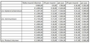 | Twee keer modaal inkomen: | 35 – 60 euro per maand |