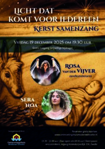 Zandkunstenares Rosa van der Vijver gooit, strooit en schuift met zand op een verlichte glasplaat en laat op betoverende wijze het kerstverhaal verschijnen. De kerstbijeenkomst is georganiseerd door het Ontmoetingshuis Moderne Devotie. Er wordt een collecte gehouden ter bestrijding van de onkosten.